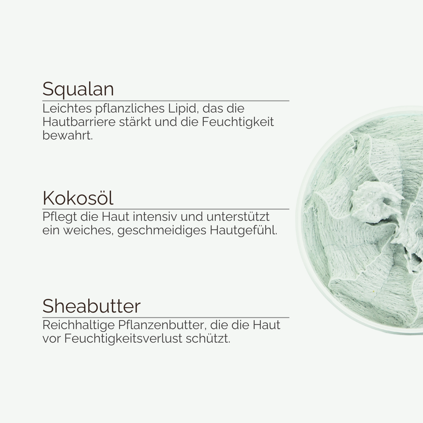 Squalan, Sheabutter und Kokosöl versorgen die Haut mit Feuchtigkeit und schützen sie vor dem Austrocknen. Die Haut fühlt sich nach dem Duschen sauber, gepflegt und angenehm weich an – ganz ohne zusätzliches Eincremen.